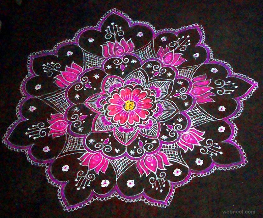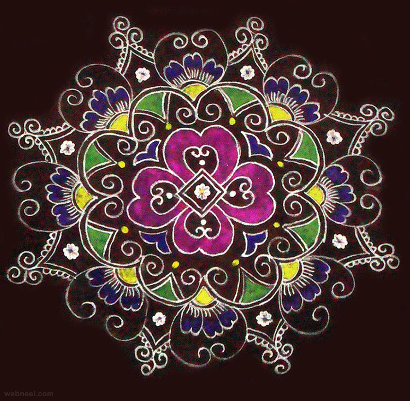 On the eve of Puthandu, a tray arranged with three fruits (mango, banana and jack fruit), betel leaves and arecanut, gold/silver jewellery, coins/money, flowers and a mirror This is similar to the Vishu new year festival ceremonial tray in Kerala. According to the Tamil tradition, this festive tray is auspicious as the first sight upon waking on the new year day Home entrances are decorated elaborately with colored rice powder. These designs are called kolams.
